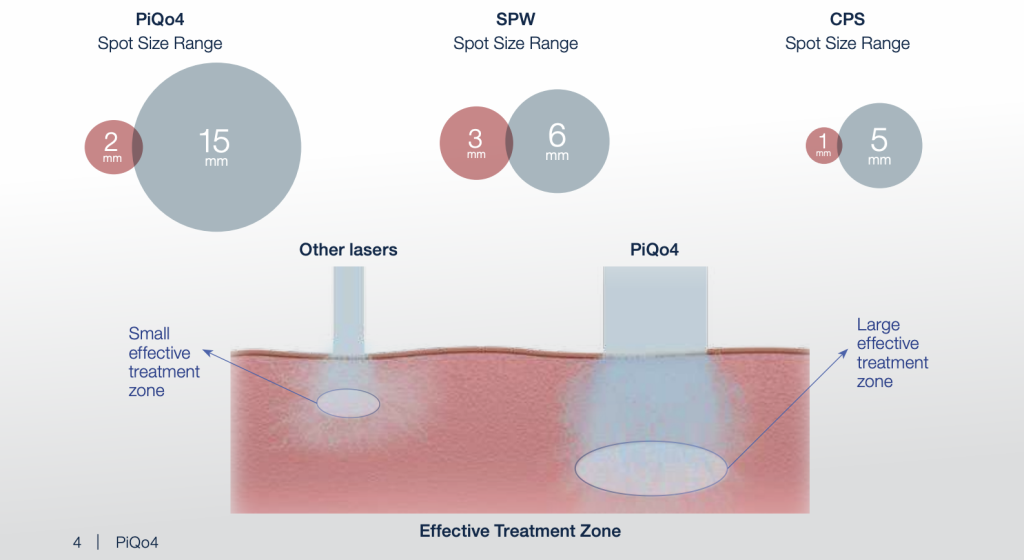 Với công nghệ PiQo4, kết quả điều trị nhanh chóng hơn và thời gian điều trị ngắn hơn. Spot Size của PiQo4 đạt đến 15mm lớn hơn gần 4 lần so với các laser thông thường.